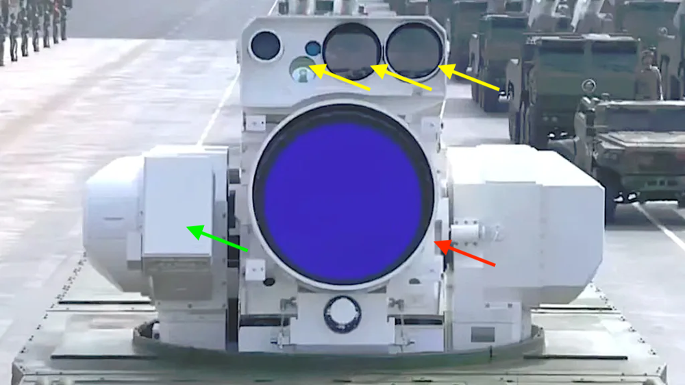 پیکربندی فیزیکی: دقیق برجک سفید نشان میدهد که این سامانه یک دریچه دایرهای بسیار بزرگ برای هدایتگر اصلی پرتو دارد (قرمز) که چندین دریچه دایرهای کوچکتر، روی باکسی در بالای آن است. این دریچههای ثانویه، حسگرهای هدفگیری و ردیابی هستند (زرد). یک ساختار جعبهمانند متمایز نیز وجود دارد که به طور بالقوه حاوی یک رادار مکمل، یک حسگر فرکانس رادیویی غیرفعال (passive) یا سایر اجزای حیاتی سامانه است (سبز).