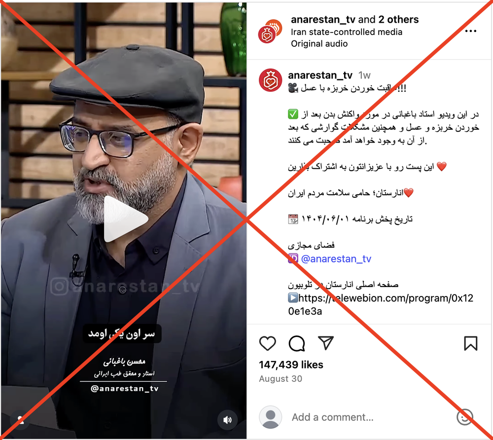در برنامه انارستان وابسته به شبکه افق برنامهای تولید و پخش شده است که در آن فردی به نام محسن باغبانی که «استاد و محقق طب ایرانی» معرفی شده میگوید خوردن خربزه با عسل باعث ایجاد جسم سختی در معده میشود که قابل خارج کردن و شکستن نیست و در موردی برای خارج کردن آن «معده را پاره کردند». او به افرادی که میخواهند خوردن خربزه و عسل را آزمایش کنند توصیه کرده حتما گیاهی به نام «سکبینج» را در دسترس داشته باشند، این گیاه به گفته او میتواند ماده چسبندهای که در معده تشکیل میشود را خرد کند و بیمار را نجات بدهد. به گفته باغبانی سه دختر دانشجوی پزشکی در شهری (که نام اش ذکر نشد) خواستند ثابت کنند خوردن خربزه و عسل با هم مشکلی ندارد. دکترها مجبور شدند معده یکی را پاره کنند، به دیگری «سکبینج» دادند و از وضعیت سومی خبر ندارد.