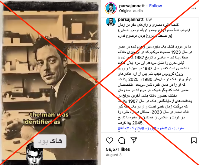 یک حساب پربیننده در اینستاگرام ویدیویی را منتشر کرده که در آن ادعا میشود در جریان حفاری و کشف مقبرههای باستانی مصر، عکسی از یک دانشمند به نام ایلان هاک کشف شده است.