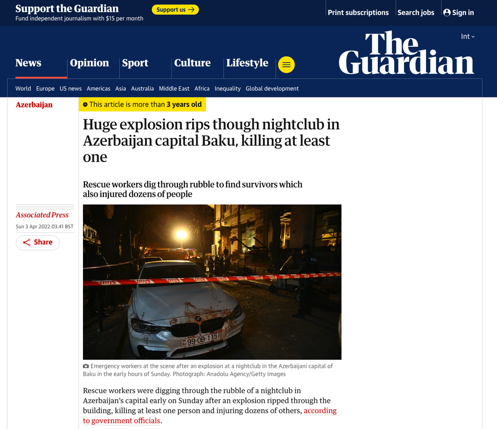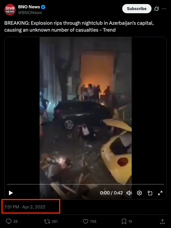 از روز گذشته تا حالا، چند سایت خبری مثل انتخاب و تابناک و همچنین بسیاری از کانالها و حسابهای کاربری در شبکههای اجتماعی (X، اینستاگرام و تلگرام) ویدیوها و خبرهایی را با عنوان «تصاویر انفجار خونین در یک کلوپ شبانه باکو» منتشر کردهاند. آنها خبر انفجار را به نقل از رسانههای آذربایجان و ترکیه منتشر کردهاند و گفتهاند بر اثر آن تلفات زیادی بر جای مانده است.