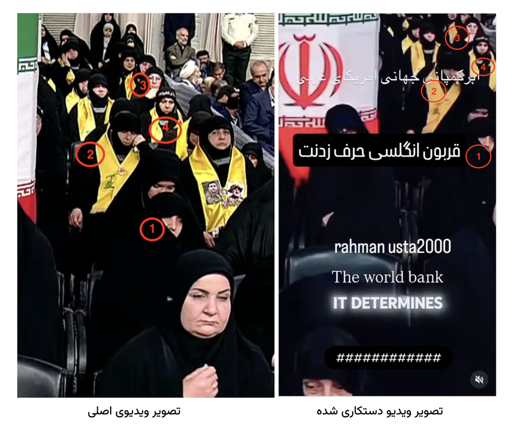 مقایسه حاضران در این سخنرانی که در «حسینیه امام خمینی» تهران انجام شده است با ویدئوهای منتشر شده از صحبتهای خامنهای به زبان انگلیسی نشان از تطابق ویدئوها دارد.
