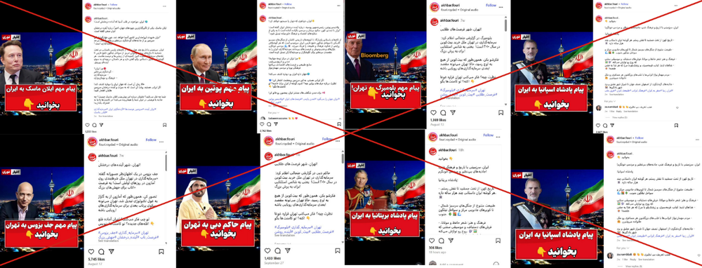 یکی از قالبهای رایج این پستها، پیامهای ساختگی منسوب به رهبران سیاسی جهان است. در این پستها متنهای تقریبا یکسانی با تغییر نام گوینده منتشر میشوند؛ یک روز به پادشاه بریتانیا نسبت داده میشود، روز دیگر به امانوئل مکرون، ولادیمیر پوتین، شی جینپینگ، پادشاه اسپانیا، امیر قطر یا محمد بنسلمان. در همهی آنها، ساختار متن یکسان است: ستایش از تاریخ و تمدن ایران، نام بردن از تخت جمشید، نقش رستم یا پاسارگاد، اشاره به طبیعت متنوع ایران از جنگلهای شمال تا کویر مرکزی، و تعریف از غذاهای سنتی مثل کباب، قرمهسبزی و زرشکپلو با مرغ.