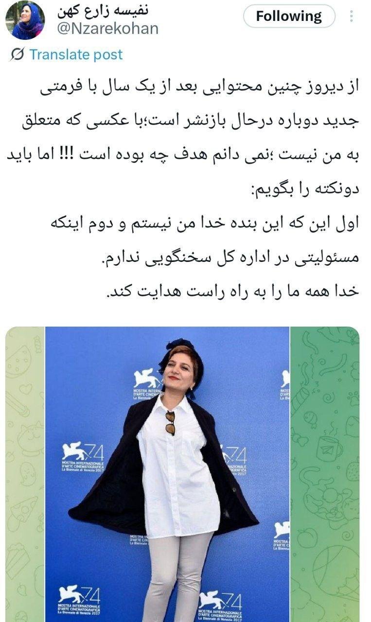 عکسهای منتشر شده در این خبر مربوط به «نفیسه زارع» بازیگر و کارگردان است. عکسی که از او منتشر شده مربوط به عکاسی رسمی فیلم ناپدید شدن در ونیز است و ارتباطی با «نفیسه زارعکهن» ندارند.