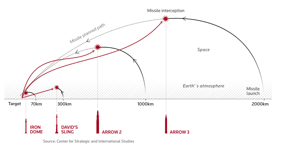 ابتدا باید سپر دفاعی اسرائیل را که این ارتقاء ها برای شکست آن طراحی شدهاند، بهطور خلاصه مرور کنیم. این سامانه چندلایه شامل موارد زیر است: