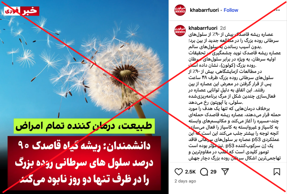 بنابراین فکتنامه به ادعای منتشرشده در شبکههای اجتماعی که «عصاره ریشه قاصدک سلولهای سرطانی روده بزرگ را از بین میبرد» نشان نادرست میدهد.