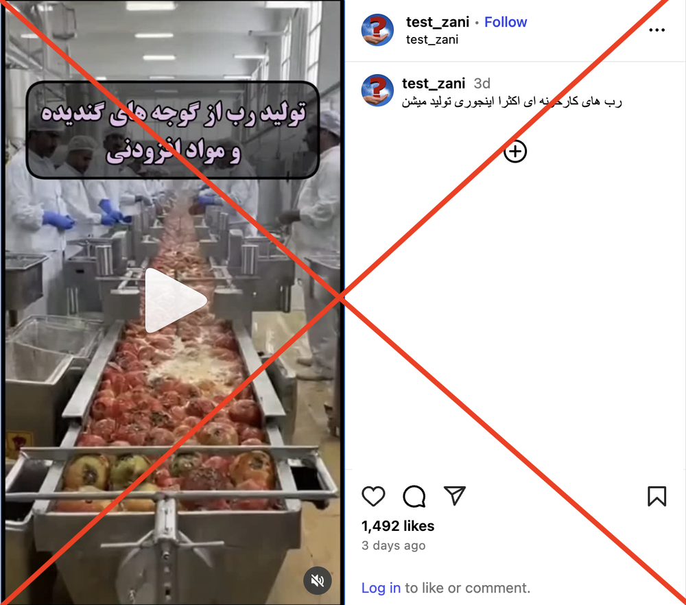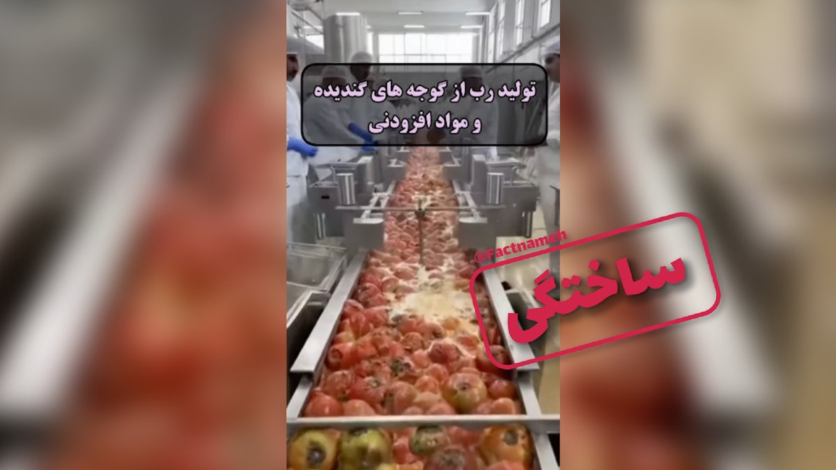 با توضیحات بالا، فکتنامه به ویدیو مربوط به تولید رب گوجهفرنگی از «گوجههای گندیده و مواد افزودنی» نشان شاخدار میدهد.