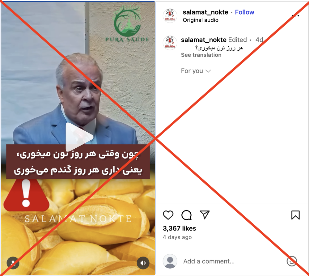 در شبکههای اینستاگرامی ادعایی منتشر شده که در آن فردی در حال حرف زدن به زبان اسپانیایی است و میگوید قطع مصرف نان باعث افزایش سلامت انسان میشود. او میگوید: