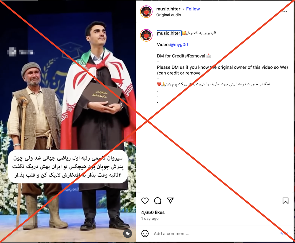 در چند روز گذشته ویدیویی در اینستاگرام بارها بازنشر شده (لینک۱، لینک۲، لینک۳) که در آن پسری جوان که پرچم ایران را بر دوش دارد در کنار مردی با چهره غمگین و لباس چوپانی نشان داده میشود. در توضیح عکس آمده است: «سیروان قاسمی رتبه اول ریاضی جهانی شد ولی چون پدرش چوپان بود هیچکس در ایران بهش تبریک نگفت».