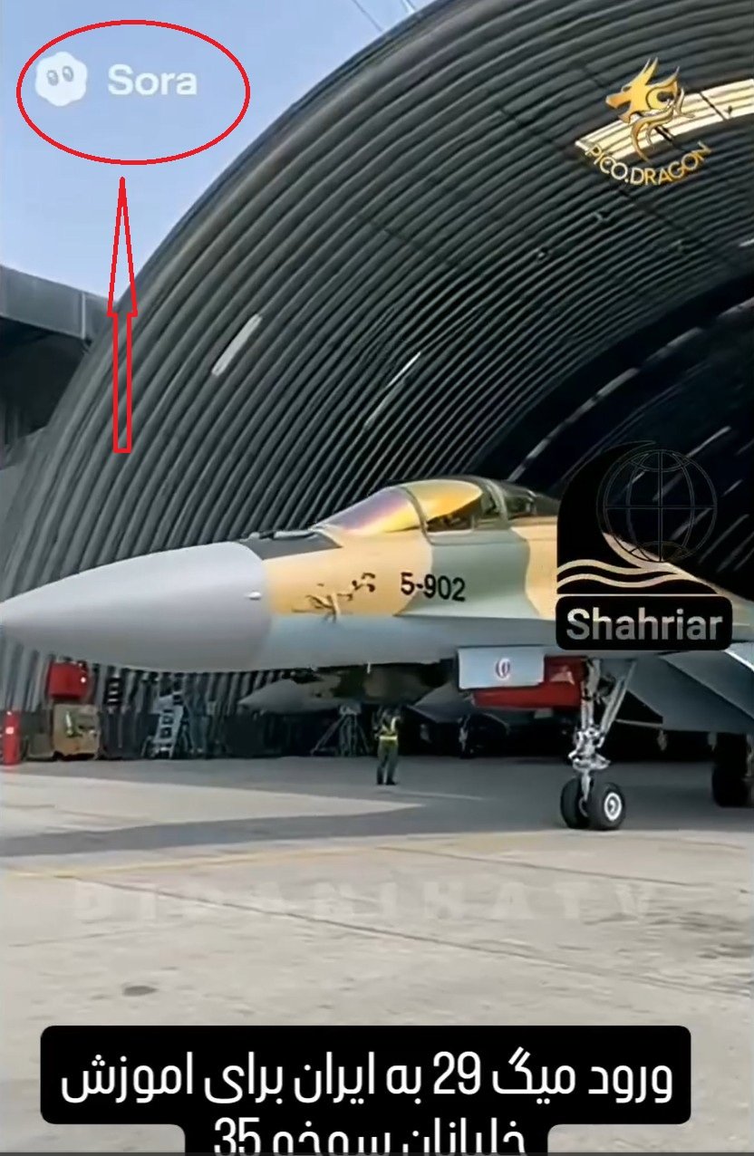 ویدیویی که در آن ادعا شده «میگ-۲۹ برای آموزش خلبانان سوخو-۳۵ وارد ایران شد» نیز با ابزار هوش مصنوعی SORA ساخته شده است:
