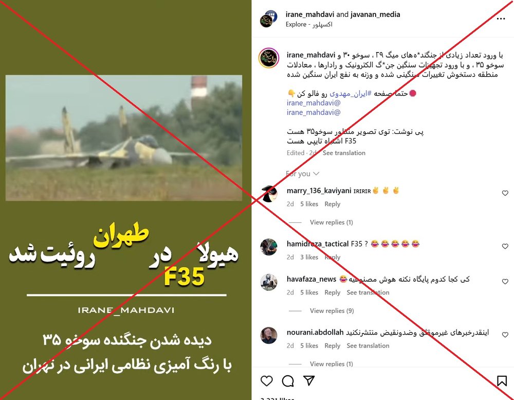 تصویری که ادعا میشود یک جنگنده سوخو-۳۵ در تهران است، دارای هیچ نشانهای از شهر تهران یا هیچ مکان خاص دیگری نیست.