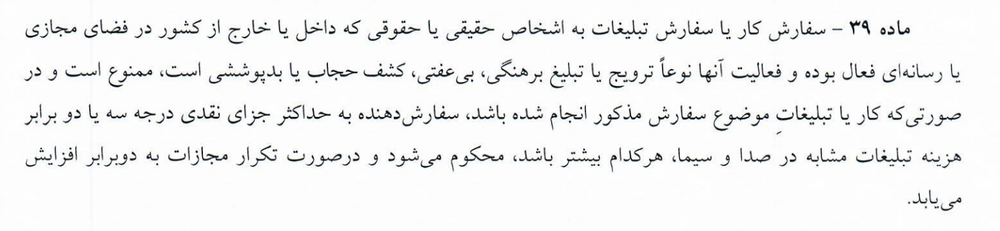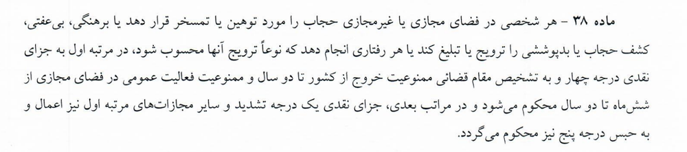 در تبصره این ماده هم تاکید شده که «پخش محتوای صوت و تصویر فراگیر حاوی برهنگی، بی عفتی، کشف حجاب یا بد پوششی از مصادیق جرم موضوع این ماده محسوب میشود».