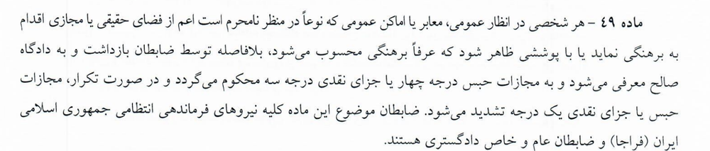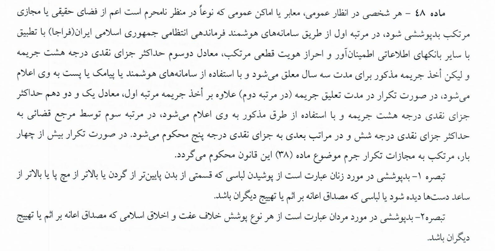 ماده ۴۸ این مصوبه هم تاکید دارد که «بدپوششی» در «معابر و اماکن عمومی» میتواند از جریمه نقدی تا حبس را برای زنان و مردان در پی داشته باشد: