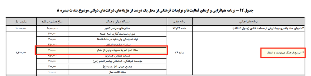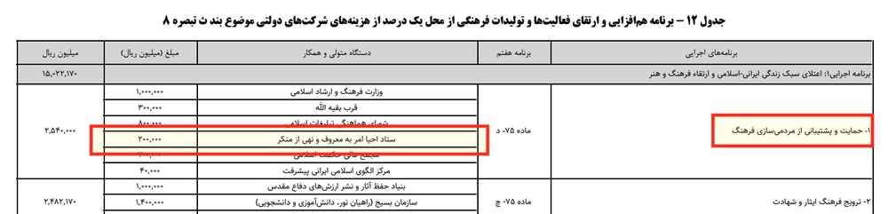 به جز این در جدول شماره ۱۲ هم مقرر شده از محل هزینههای دستگاههای اجرایی در قالب دو ردیف ۴۰ میلیارد تومان دیگر برای «حمایت و پشتیبانی از مردمیسازی فرهنگ» و «ترویج فرهنگ مهدویت و انتظار» به ستاد امر به معروف و نهی از منکر پرداخت شود. (جدول شماره ۱۲ صفحات ۱۷۷ و ۱۷۸ قانون بودجه سال ۱۴۰۴)