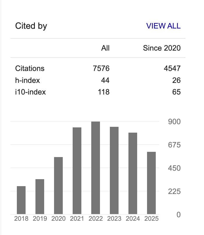 با وجود این، بر اساس اطلاعات منتشر شده در وبسایت گوگلاسکولار او در مجموع در ۴۴ مقاله نویسنده همکار بوده و در مجموع ۷۵۷۶ بار به آثار او ارجاع داده شده است. شاخص اچ (h-index) مقالات او هم ۴۴ است، یعنی ۴۴ مقاله دارد که هرکدام دستکم ۴۴ بار ارجاع گرفتهاند.