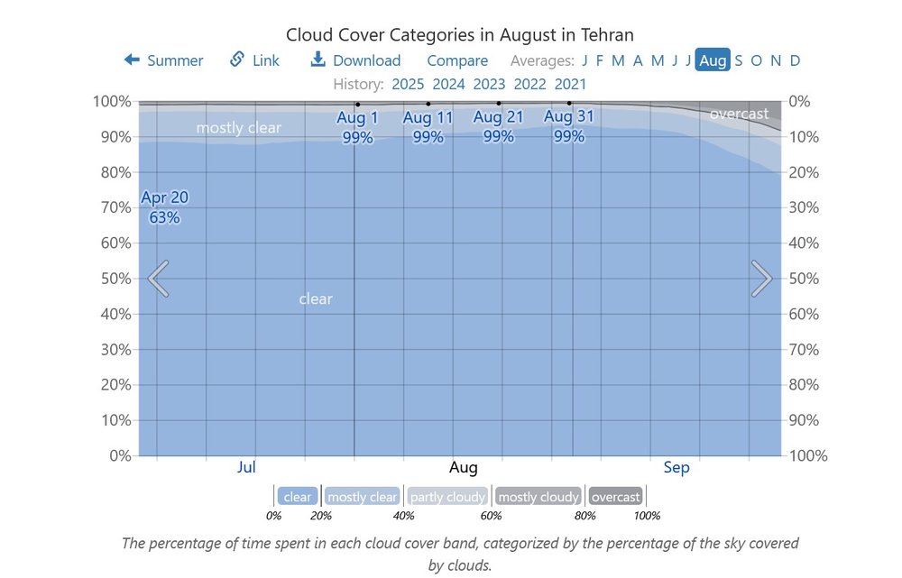 گزارشهای ماهانهی رسمی استان تهران در مرداد ۱۴۰۴، شاخص «روزهای ابری» را بهصورت شمارش روز منتشر نمیکنند، اما همان بولتن نشان میدهد ماه، گرم و کمبارش بوده و بیشتر تمرکز بر دما، بارش، باد و هشدارها است. برای برآورد وضعیت آسمان میتوان به دادههای رصد فرودگاهی تکیه کرد. تجمیع دادههای NOAA/ISD که در WeatherSpark نمایش داده میشود، میگوید اوت (مرداد) در تهران «صافترین ماه سال» است و سهم زمان «ابری یا عمدتا ابری» حدود ۱٪ است؛ یعنی در عمل ۰ تا ۱ روز واقعا ابری در کل ماه. از این برخلاف گفته در مرداد ماه ابرهای پربار و خاکستری در آسمان تهران نداشتیم.