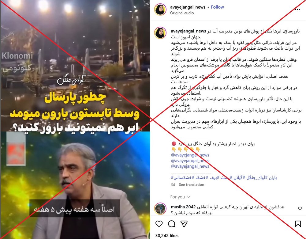 به بیان ساده هشدارها در رابطه با وقوع سیلاب از قبل صادر شده بود، الگوی جوی و توپوگرافی توضیح میدهد که دقیقا چه اتفاقی افتاده، و شواهدی از دستکاری هدفمند آبوهوا در آن شب در دست نیست. بنابراین ربطدادن سیلاب ۲۴ خرداد ۱۴۰۳ به بارورسازی ابرها، نادرست است.