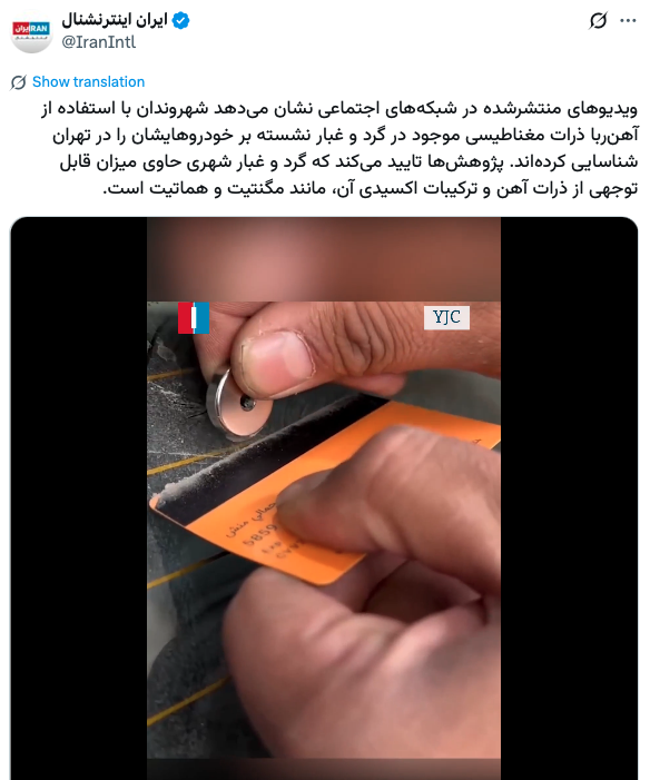 در روزهای پایانی آبان ۱۴۰۴، همزمان با اوجگیری آلودگی هوا در تهران، ویدئوهایی در شبکههای اجتماعی دستبهدست شد که در آن شهروندان با جمعکردن غبار روی سطح خودرو و نزدیککردن آهنربا، نشان میدادند ذرات گردوغبار جذب میشوند. همین تصاویر باعث انتشار شایعهای گسترده شد مبنی بر اینکه «هوای تهران حاوی ذرات آهن است». یکی از ویدئوهایی که توجه زیادی برانگیخت، فیلمی بود که هم باشگاه خبرنگاران جوان (وابسته به صداوسیمای جمهوری اسلامی) و هم تلویزیون ایراناینترنشنال بازنشرش کردند.