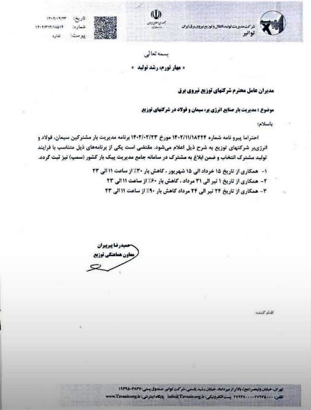 اردیبهشتماه سال ۱۴۰۲ نیز شماری از رسانهها، نامهای از شرکت توزیع نیروی برق به صنایع سیمان و فولاد، منتشر کردند که در قالب سه برنامه پیشنهادی، تخصیص برق به این صنایع از خرداد تا مرداد آن سال را سهمیهبندی میکرد.