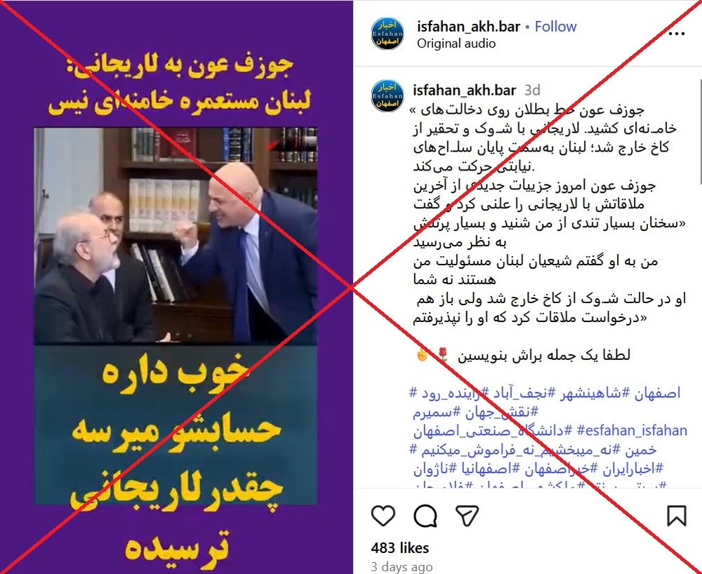بنابراین فکتنامه به این ویدیوها و ادعا که جوزف عون، رئیس جمهور لبنان بر سر لاریجانی فریاد زده و او را از اتاقش بیرون کرده، نشان «نادرست» میدهد.
