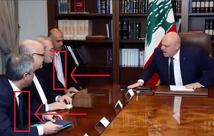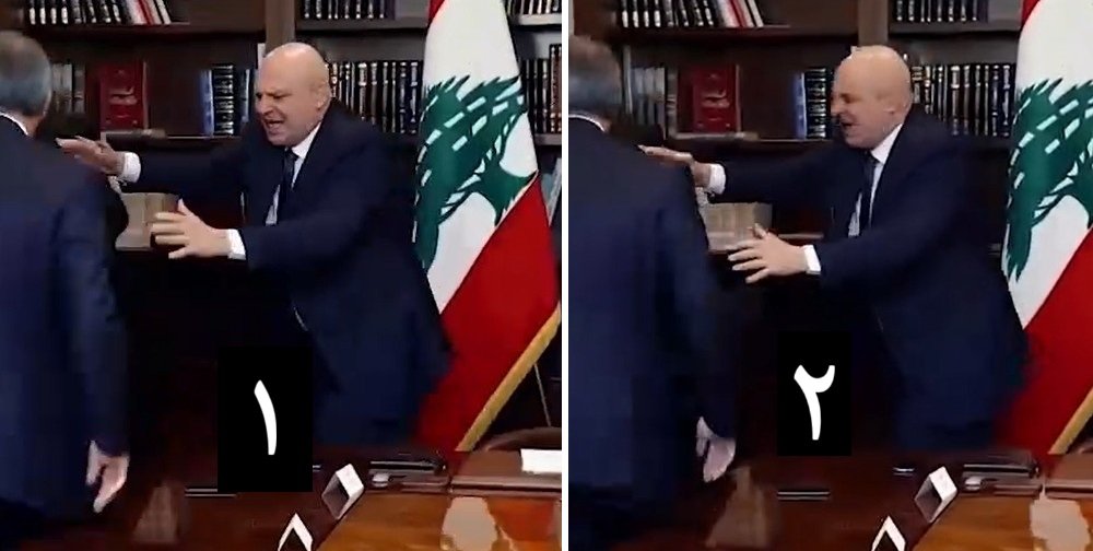 در یک ویدیو جوزف عون از جا برمیخیزد، و لاریجانی و تیم همراهش را که دو نفر از آنها کراوات دارند از اتاق بیرون میکند. در ویدیوی دیگر لاریجانی دستانش را در پاسخ به جوزف عون بالا میبرد و حرکت دست جوزف عون با ویدیوی دیگر متفاوت است.
