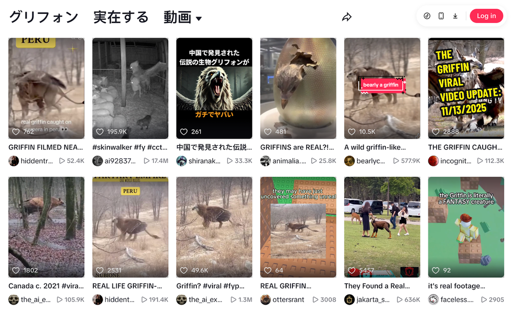 در کنار این دو دلیل که اولا این موجودات اساسا افسانهای و غیرواقعی هستند و هیچ گزارش محیط زیستی درباره وجود آنها یا حتی چیزی شبیه آنها وجود ندارد و ثانیا نشانههای تصویری که میتواند ساختگی بودن ویدیوها را ثابت کند، باید اشاره کنیم که این ویدیوها چند ماه و حتی بیش از یک سال قبل هم در حسابهای کاربری غیرفارسی نیز منتشر شده بود. دنبال کردن سرنخها، ما را به حسابهایی در تیکتاک میرساند که دهها ویدیوی مشابه از موجودات خیالی از جمله گریفین را ساخته و منتشر کردهاند.