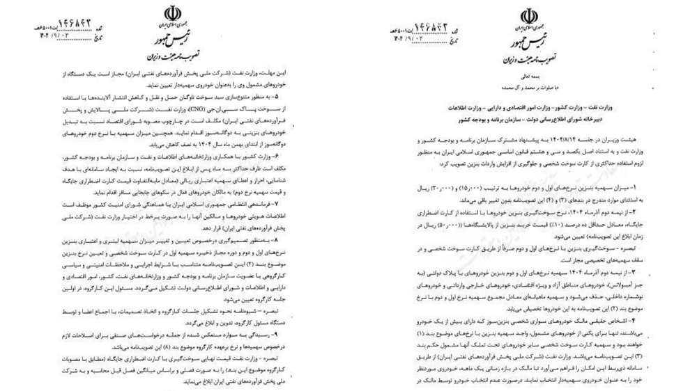 همچنین بر اساس بند ۳ این مصوبه، تنها به یک خودرو از هر شخص حقیقی سهمیه بنزین ۱۵۰۰ و ۳۰۰۰ تومانی تعلق میگیرد و این اشخاص یک ماه فرصت خواهند داشت تا از میان خودروهای تحت مالکیت خود یک خودرو را برای دریافت سهمیههای اول و دوم سوخت به شرکت ملی پخش فرآوردههای نفتی ایران، معرفی کنند.