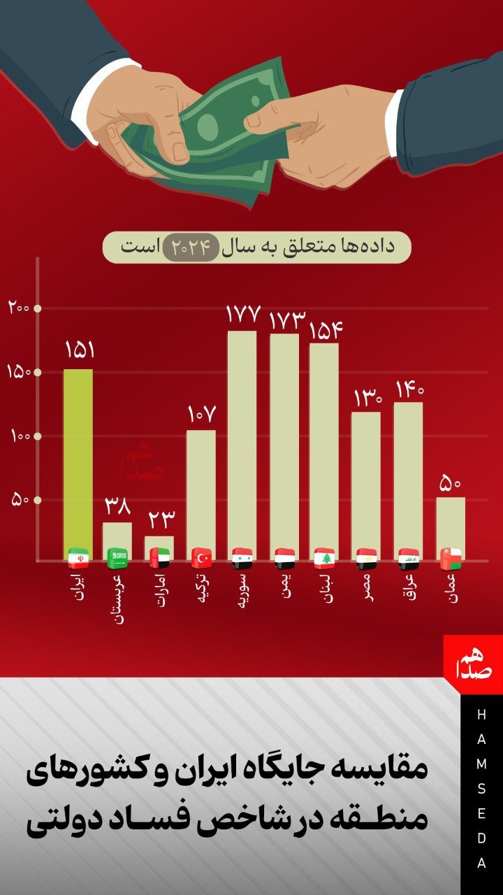 کانال تلگرامی همصدا، تصویری منتشر کرده که در آن جایگاه ایران و کشور های منطقه در شاخص فساد دولتی مقایسه شده است.