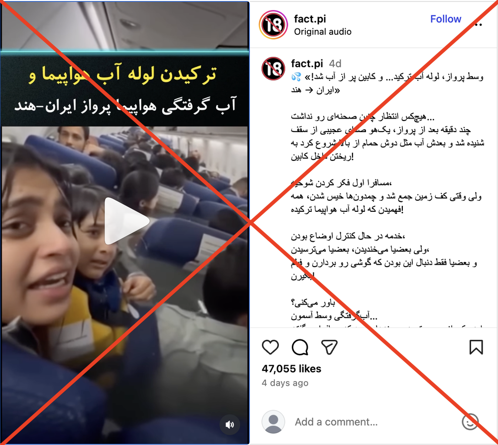 ویدیویی در صفحات اینستاگرام منتشر شده است که ادعا میکند مرتبط با «ترکیدن لوله آب و آبگرفتگی هواپیما در پرواز ایران-هند» است. این ویدیو مسافران را نشان میدهد که در صندلیهای خود نشستهاند در حالی که آب تا سینه مسافران بالا آمده و در توضیح آن نوشته شده «وسط پرواز، لوله آب ترکید و کابین پر از آب شد».