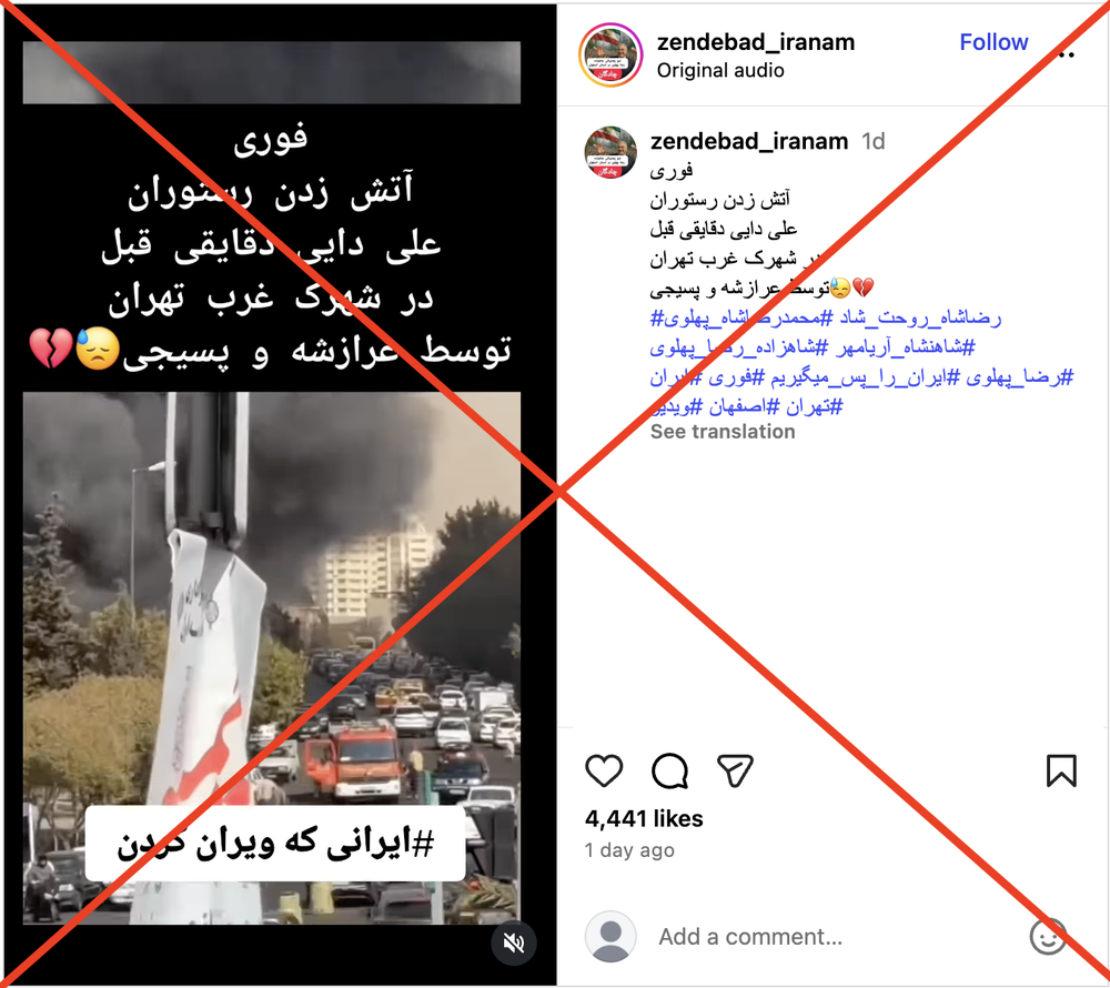 در شبکههای اجتماعی ویدیویی منتشر شده که ادعا میکند آتش گرفتن رستوران علی دایی در شهرک غرب را نشان میدهد. این ویدیو در سطح وسیعی بازنشر شده است (لینک۱، لینک۲، لینک۳).