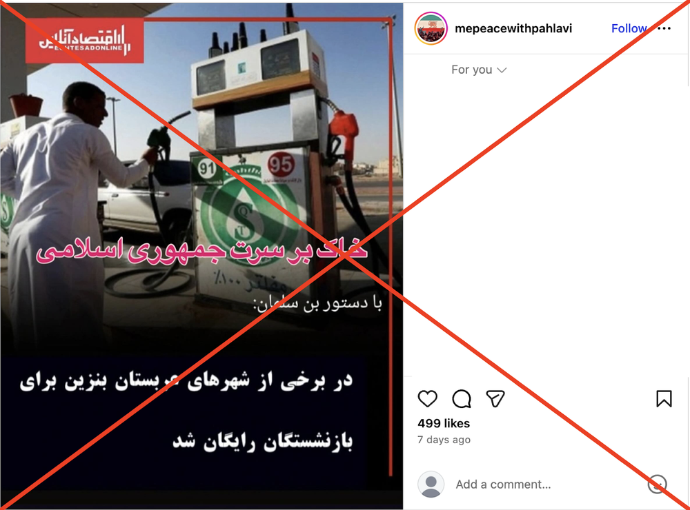 در شبکههای اجتماعی فارسی عکسنوشتهای منتشر شده که ادعا میکند با دستور بن سلمان در برخی از شهرهای عربستان بنزین برای بازنشستگان رایگان شد. در تصویری که منتشر شده از لوگو و طراحی وب سایت «اقتصاد آنلاین» استفاده شده به طوری که به نظر بیاید منبع خبر این وبسایت است. (لینک۱، لینک۲، لینک۳)