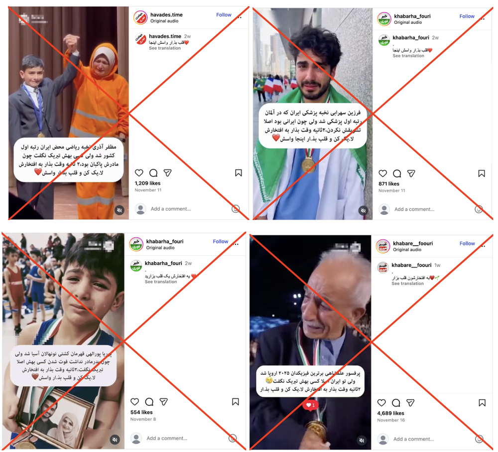 مجموعهای از ویدیوهای ساختگی در صفحات اینستاگرام منتشر میشوند که همگی مضمونی کمابیش مشابه دارند.( لینک ۱، لینک ۲، لینک ۳، لینک ۴، لینک ۵، لینک ۶) در این ویدیوهای بسیار کوتاه، شخصی اغلب گریان یا غمگین نشان داده میشود که «نخبه» است اما به دلیل «فقر»، «تبعیض» یا «بیکسی» یا دلایلی مشابه قدر ندیدهاند.