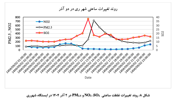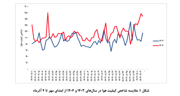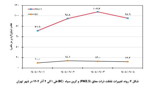 شدت این بحران در دوره مورد بررسی گزارش، یعنی از اول تا ششم آذرماه ۱۴۰۴، به اوج خود رسید. در روز سوم آذر، میانگین غلظت ۲۴ ساعته PM2.5 به ۱۰۷ میکروگرم بر متر مکعب رسید. این رقم، که سلامت شهروندان را به طور جدی تهدید میکند، تقریبا ۱۰ برابر بیشتر از حد رهنمود سازمان بهداشت جهانی است. همچنین براساس این گزارش غلظت PM2.5 از ابتدای سال تا پنجم آذر ۱۴۰۴، نسبت به دوره مشابه در سال ۱۴۰۳، با یک افزایش ۱۳ درصدی مواجه بوده است.