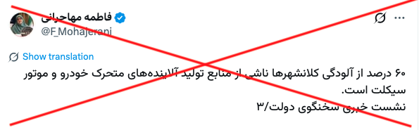 بنابراین فکت نامه به ادعای فاطمه مهاجرانی، سخنگوی دولت جمهوری اسلامی ایران که «۶۰ درصد از آلودگی کلانشهرها ناشی از منابع تولید آلایندههای متحرک خودرو و موتور سیکلت است» نشان گمراهکننده میدهد.