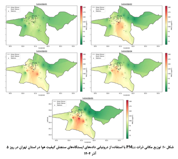 نقشههای توزیع مکانی آلودگی در گزارش به طور مداوم نشان میدهند که غلظتهای بالاتر PM2.5 در مناطق غربی و جنوبی تهران متمرکز شده است. این الگو با استقرار شهرکهای صنعتی، نقاط پسماندسوزی و کریدورهای ترافیک سنگین مانند بزرگراه آزادگان در حاشیه و خارج از شهر مرتبط است.