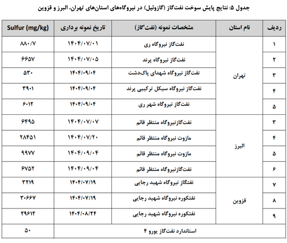 این یافته را دادههای پایش سوخت نیز تایید میکنند. مقادیر تکاندهنده گوگرد در سوخت مصرفی این نیروگاهها ثبتشدهاست؛ به عنوان مثال، ۶۰۱۲ میلیگرم بر کیلوگرم در نیروگاه شهر ری و ۶۶۵۷ میلیگرم بر کیلوگرم در نیروگاه پرند، در حالی که استاندارد مجاز تنها ۵۰ میلیگرم بر کیلوگرم است. دیاکسید گوگرد پیشساز اصلی ذرات ثانویه سولفات است که بخش مهمی از PM2.5 را تشکیل میدهند.