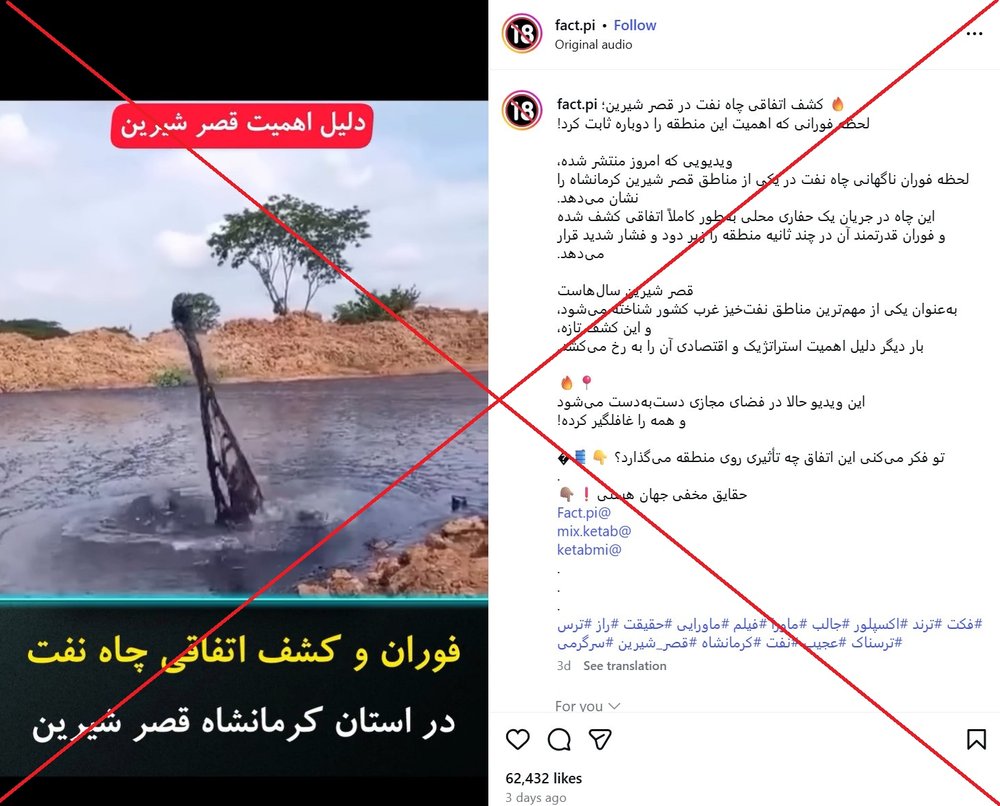 بنابراین فکتنامه به این ادعا که چاه نفت جدیدی در قصر شیرین به طور اتفاقی کشف شده است، نشان «نادرست» میدهد.