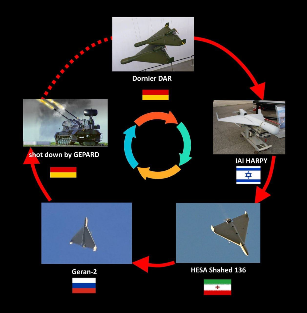 در اواسط دهه ۱۹۸۰، شرکت Dornier آلمان با همکاری تکنولوژیکی تگزاس اینسترومنتز آمریکا، پهپاد انتحاری DAR را تولید کرد. وزن این پهپاد حدود ۱۱۰ کیلوگرم، سرعت آن ۲۵۰ کیلومتر بر ساعت و بردش تا حدود ۶۰۰ کیلومتر بود. موتور پیستونی آن را شرکت آلمانی Fichtel & Sachs تامین میکرد و هر پرتابگر کامیونی میتوانست تا شش فروند DAR را بهصورت دستهای شلیک کند؛ دقیقا مشابه روشی که امروز برای شاهد-۱۳۶ استفاده میشود.
