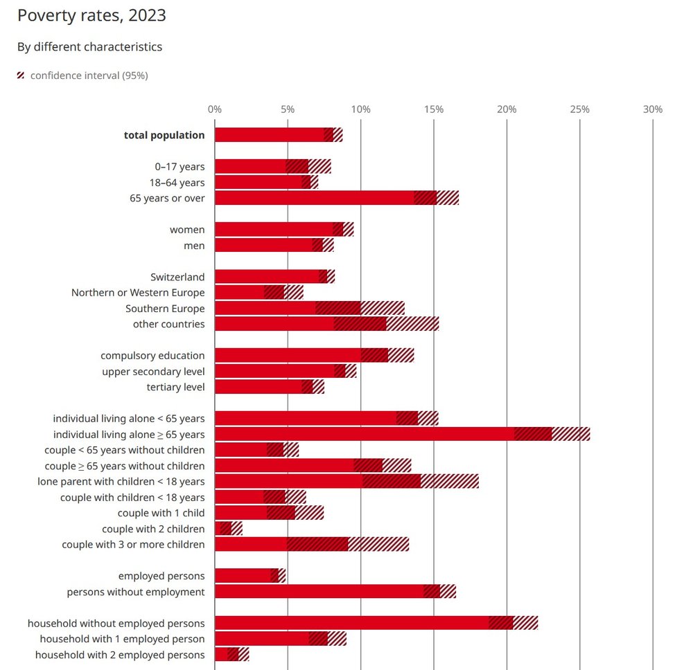 اداره فدرال آمار سوئیس همچنین اعلام کرده است که در سال ۲۰۲۳ بیش از هشت درصد مردم به طور میانگین درگیر فقر هستند. این رقم برای افراد تنهای بالای ۶۵ سال بیش از ۲۳ درصد است.