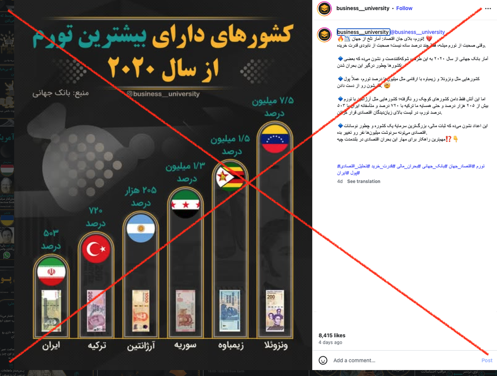 در شبکههای اجتماعی تصویر نموداری با این عنوان منتشر شده که ایران با ۵۰۳ درصد تورم تجمیعی از سال ۲۰۲۰، ششمین کشور جهان با بالاترین تورم تجمیعی است.