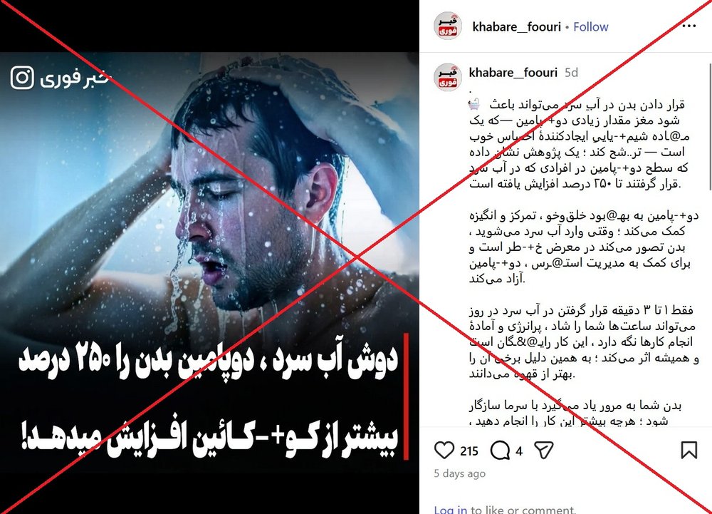 ادعایی در شبکههای اجتماعی منتشر شده که میگوید دوش آب سرد دوپامین بدن را ۲۵۰ درصد بیش از کوکائین افزایش میدهد. (لینک۱ ، لینک۲، لینک۳ ، لینک۴ ، لینک۵ ، لینک۶)