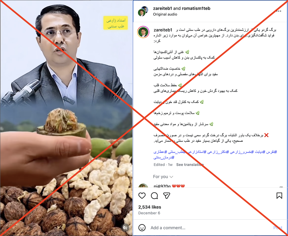 یک مروج شبهعلم «طب سنتی» مدعی است که با مصرف جوشانده برگ گردو، کلسترول، فشار خون، دیابت، التهاب و نقرس درمان میشود. خسرو زارعی در ویدیویی که در اینستاگرام پخش شده ادعا میکند که «مصرف دمکرده برگ گردو برای ۴۰ روز ناشتا» تمام این بیماریها را درمان میکند. (لینک۱)