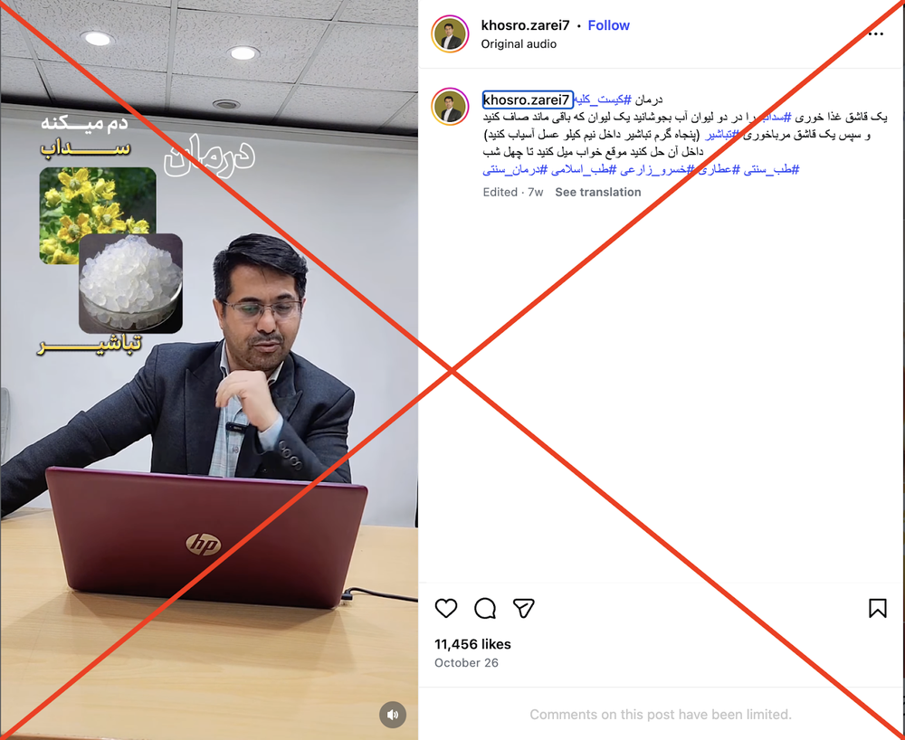 خسرو زارعی، یکی از مروجین شبهعلم طب سنتی ایرانی، در شبکههای اجتماعی ویدیویی منتشر کرده که در آن ادعا میکند پزشکی برای بیماری کیست کلیه درمانی ندارد، اما طب سنتی با سداب و تباشیر آن را درمان می کند. در توضیحات پست او آمده: