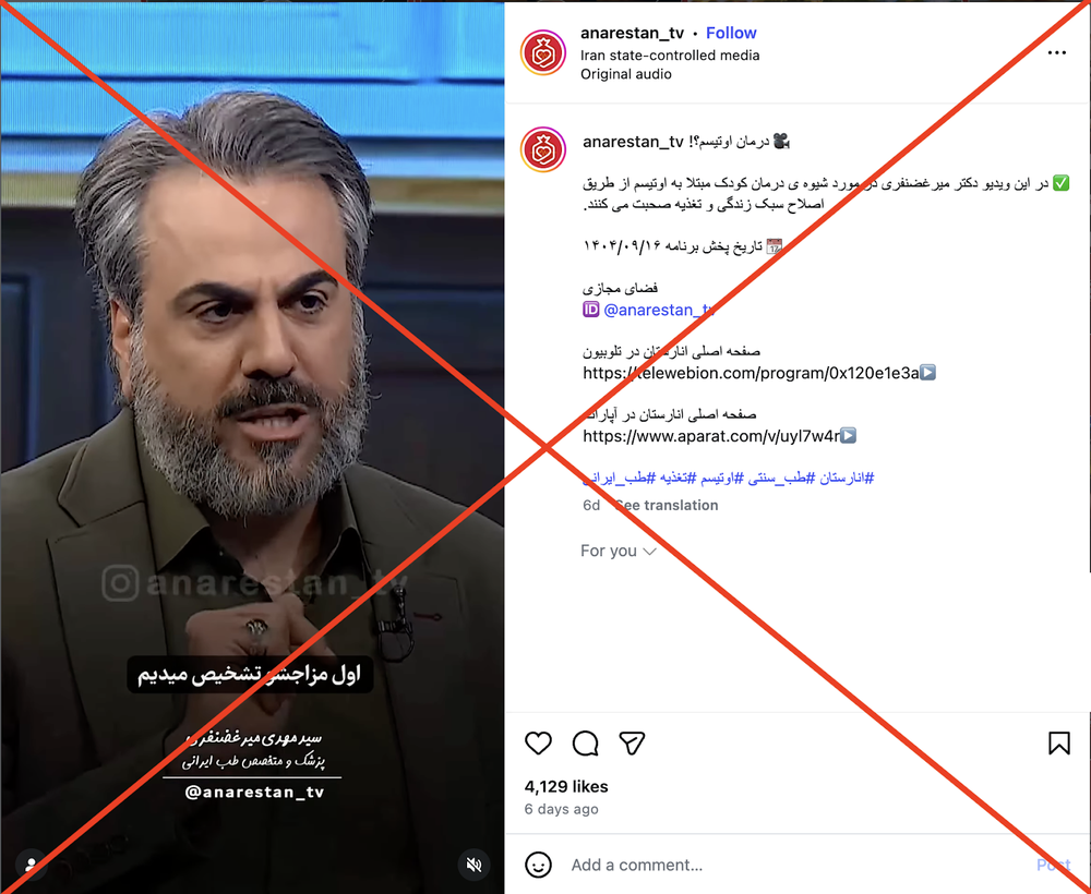 در قسمتی از برنامه انارستان که روز ۱۶ آذر از شبکه افق پخش شد، کارشناس برنامه ادعا کرده با شناخت «مزاج» میتواند کودک مبتلا به اوتیسم را «درمان قطعی» کند و پس از سه جلسه کودک «کاملا عادی» شود. او در نهایت از نورولوژیستها و روانپزشکان اطفال میخواهد کودکان مبتلا به اوتیسم را به متخصصان درمانهای طب ایرانی ارجاع دهند.