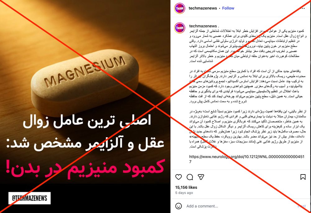 در شبکههای اجتماعی پستهایی منتشر شده که ادعا میکند اصلیترین عامل زوال عقل و آلزایمر کمبود منیزیم در بدن است (لینک۱، لینک۲). در توضیحات این پستها آمده است: