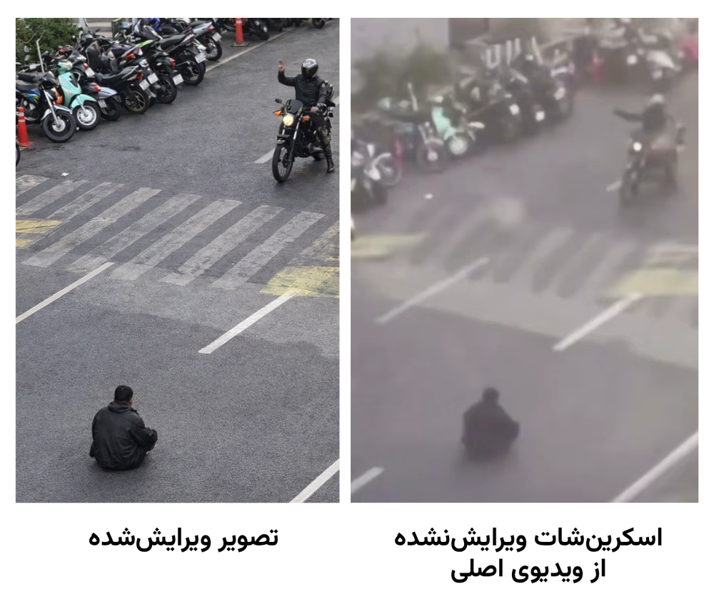 اما بلافاصله در شبکههای اجتماعی فارسی دو اتفاق افتاد. نخست، عکسهایی دست به دست شد که به نظر میرسید نسخه باکیفیتتری از آن عکسِ واقعی را نشان میداد. این عکسها با هوش مصنوعی ویرایش شدهاند و در برخی از آنها میزانسن تصویر اصلی کاملا تغییر داده شده است. برای نمونه، پلاک موتورسیکلتهای پارکشده در کنار خیابان، به نظر میرسد که مربوط به ایران نیست، لباس فرد نشسته روی زمین تا حدی تغییر کرده و بین او و ماموران موتورسوار جمهوری اسلامی، خط عابر پیاده دیده میشود در حالی که در تصویر اصلی و واقعی، چنین خطیکشیای دیده نمیشود.