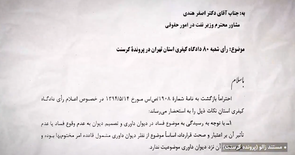 در لحظات پایانی تصاویری از دادنامه شعبه ۸۰ کیفری استان تهران به نمایش درمیآید. مطابق تصویر تاریخ حکم ۲۶ فروردین ۱۳۹۰ است. در این تصاویر نام چند نفر از مدیران وزارت نفت دیده میشود. در مستند گفته میشود فساد این افراد در دیوان عالی مسجل شده و آنها به انفصال از خدمت و زندان محکوم شدهاند اما همان وقت تصویر نامه دیگری نشان داده میشود که در یکی از بندهای آن به صراحت نوشته شده: