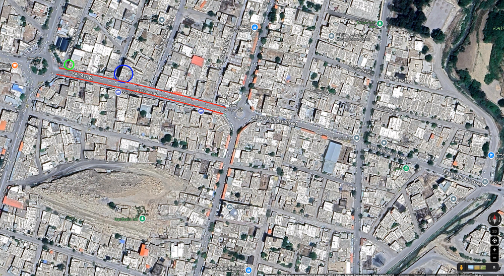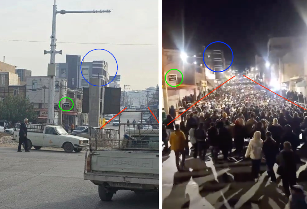 برای داشتن برآوردی معتبر، پیش از هر چیز موقعیت مکانی ویدئو را بررسی کردیم. با استناد به عناصر مشابه، از جمله تابلوی داروخانه (داروخانه دکتر میرزایی) و ساختمان چهار طبقه با نمای محدب، در این ویدئو با تصویر دیگری که یک سال و سه ماه قبل در سالگرد مهسا امینی از میدان بسیج منتشر شده بود، میتوان با اطمینان گفت که که محل استقرار دوربین، میدان بسیج آبدانان است و جمعیت به جهت شرق به سوی میدان ولیعصر حرکت میکند.