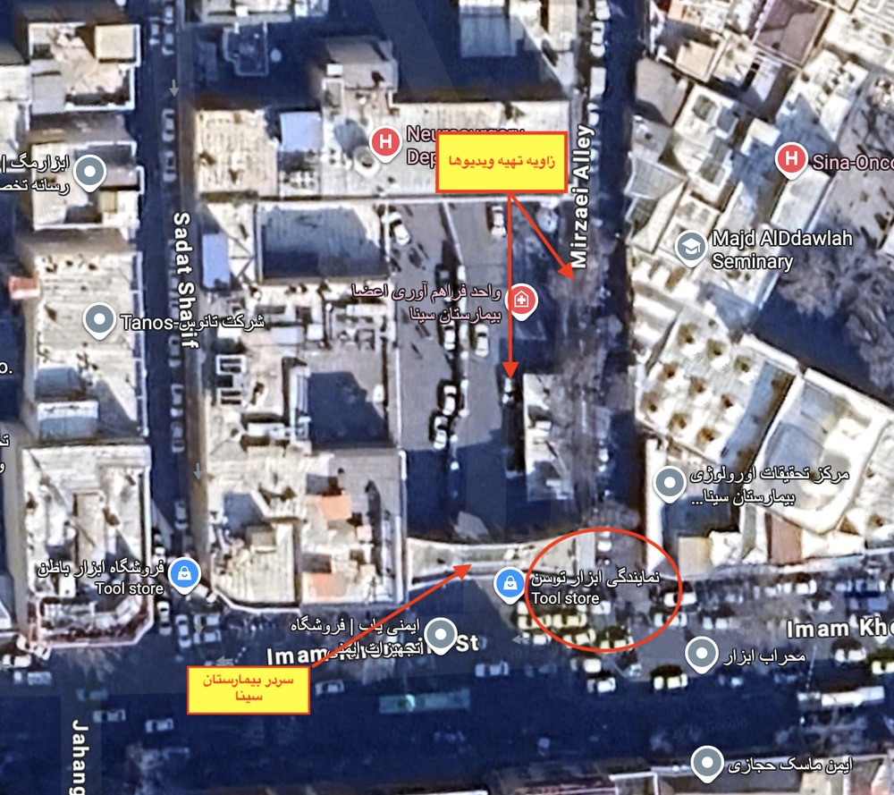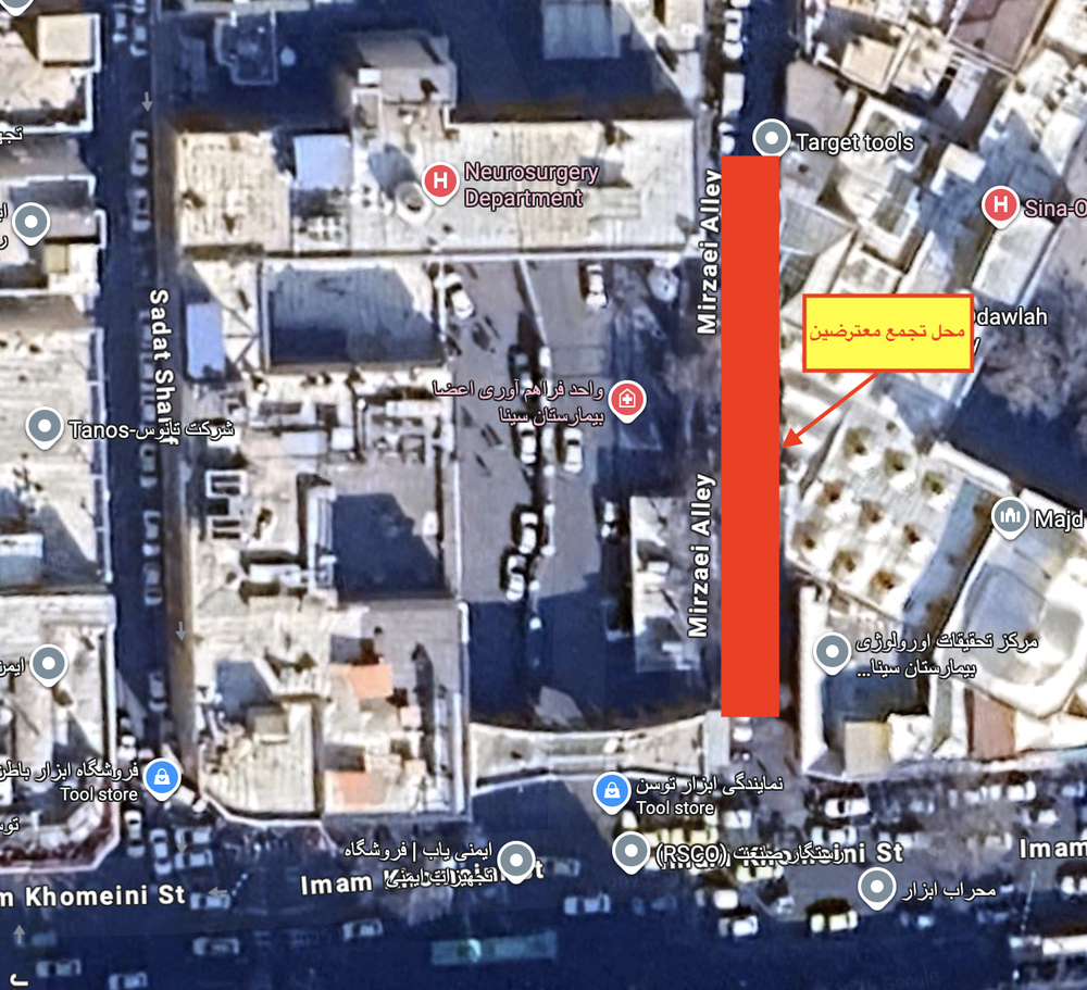 در ویدیو همچنین محل تجمع معترضان در کوچه کنار بیمارستان یعنی، کوچه میرزایی دیده می شود.