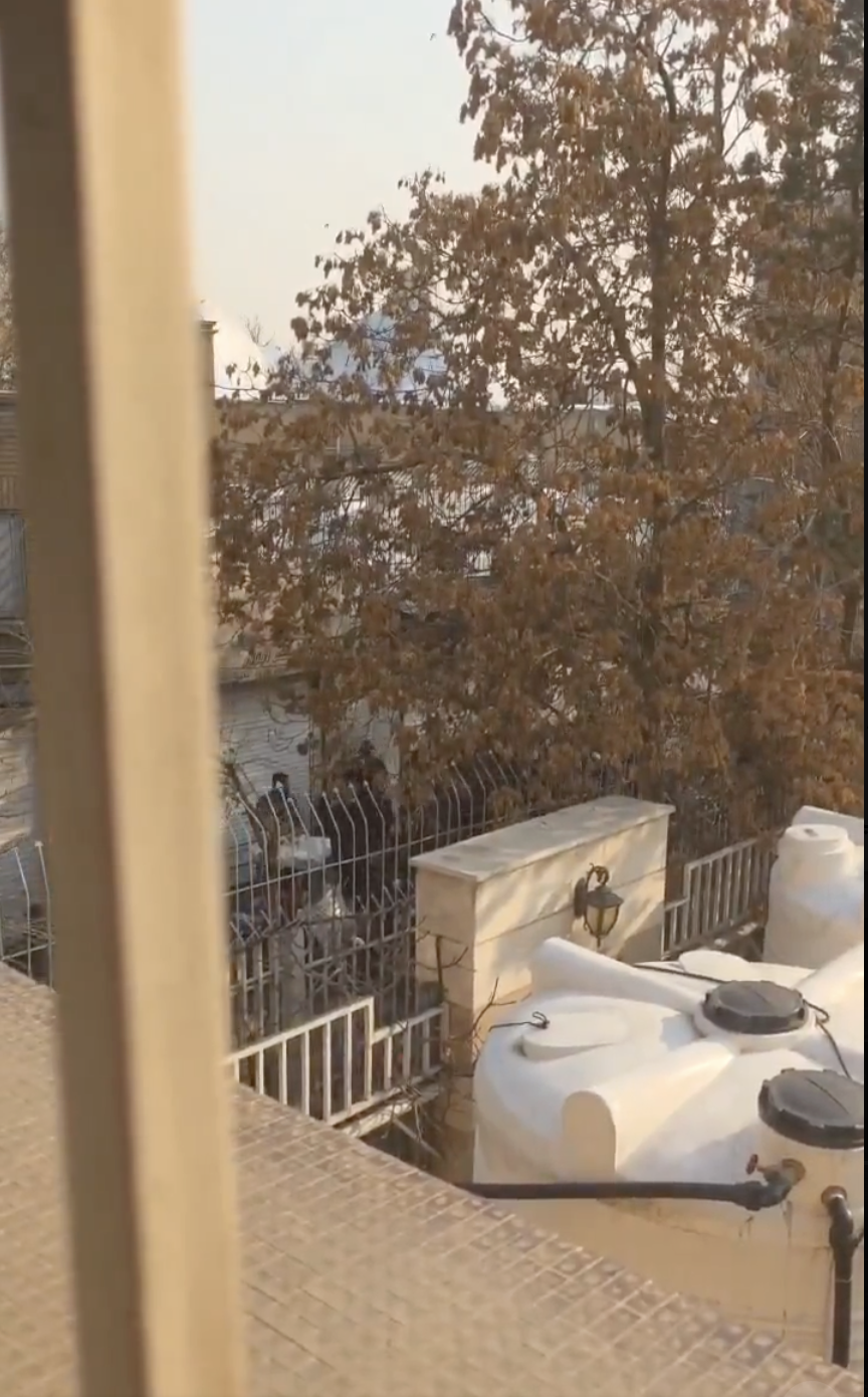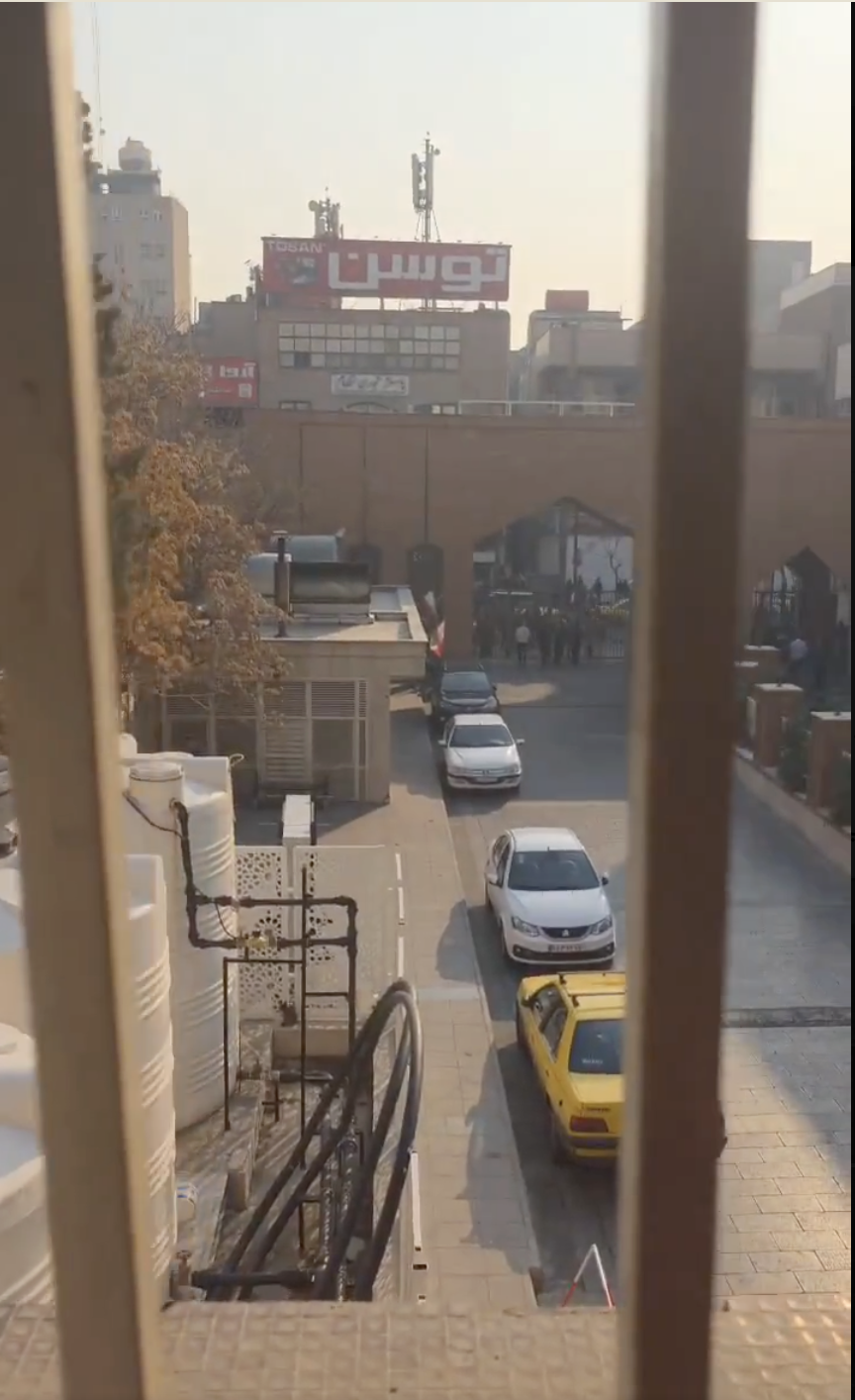 در ویدیوها و عکسها دیده میشود که در ورودی بیمارستان بسته است و اثری از زد و خورد و یا حضور معترضان و نظامیان در حیاط بیمارستان دیده نمیشود. اما دود به وضوح در محوطه پخش شده است.