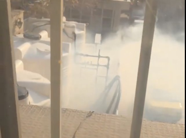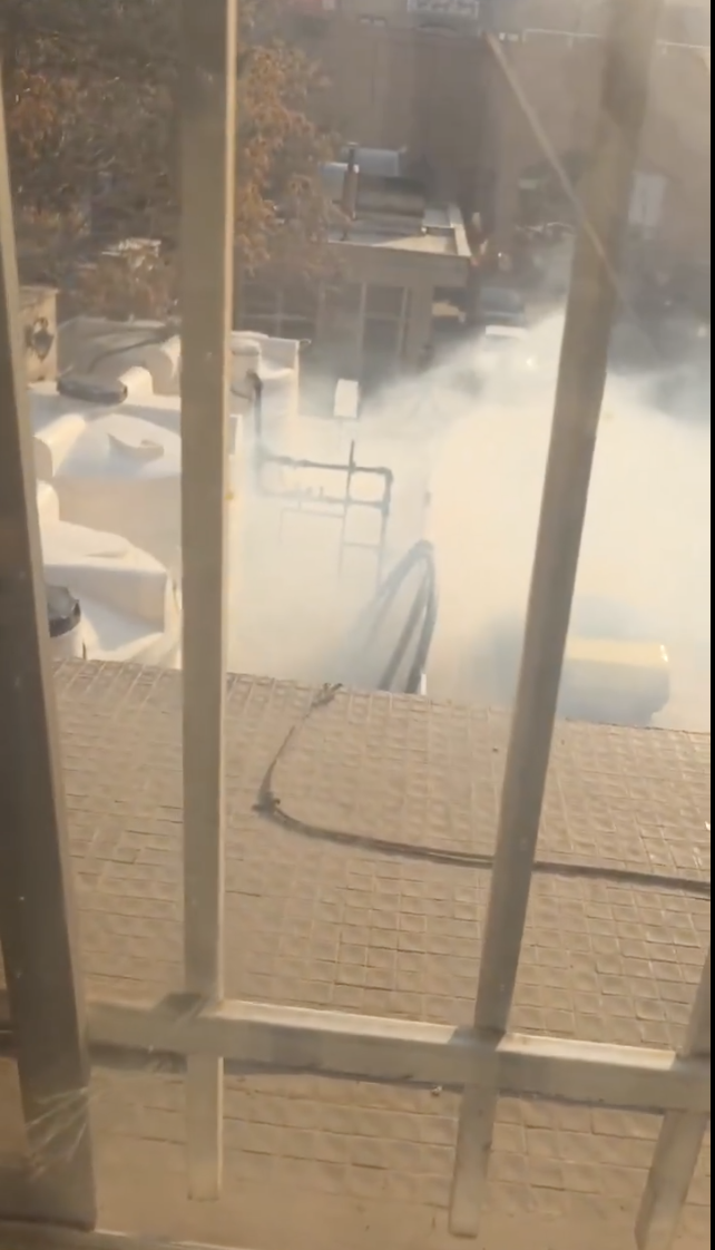 در ویدیوی که در آن گاز اشکآور در محوطه بیمارستان دیده میشود جهت حرکت و تراکم دود نشان میدهد که احتمالا منبع دود از آن سوی نردههای بیمارستان در کوچه میرزایی، به داخل بیمارستان پرتاب شده است.